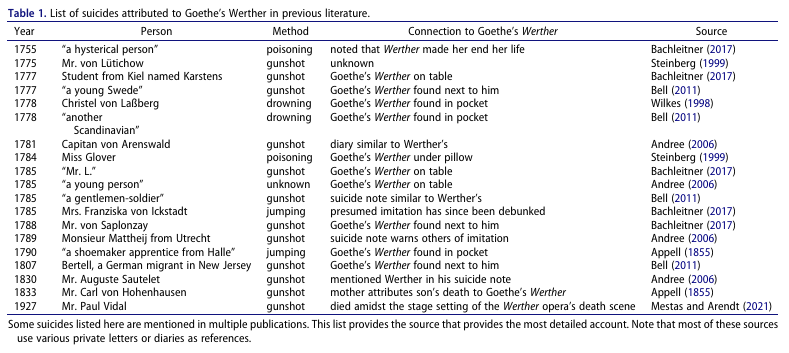 In hindsight, the panic surrounding The Sorrows of Young Werther presents an early example of society struggling with the power of the media. In 1974, sociologist David Phillips coined the term “Werther Effect” to describe the phenomenon whereby reporting on high-profile suicides can lead to measurable increases in imitation. If this is true, the extensive coverage and moral outrage surrounding Goethe’s novel may have amplified the very behaviours they sought to prevent.